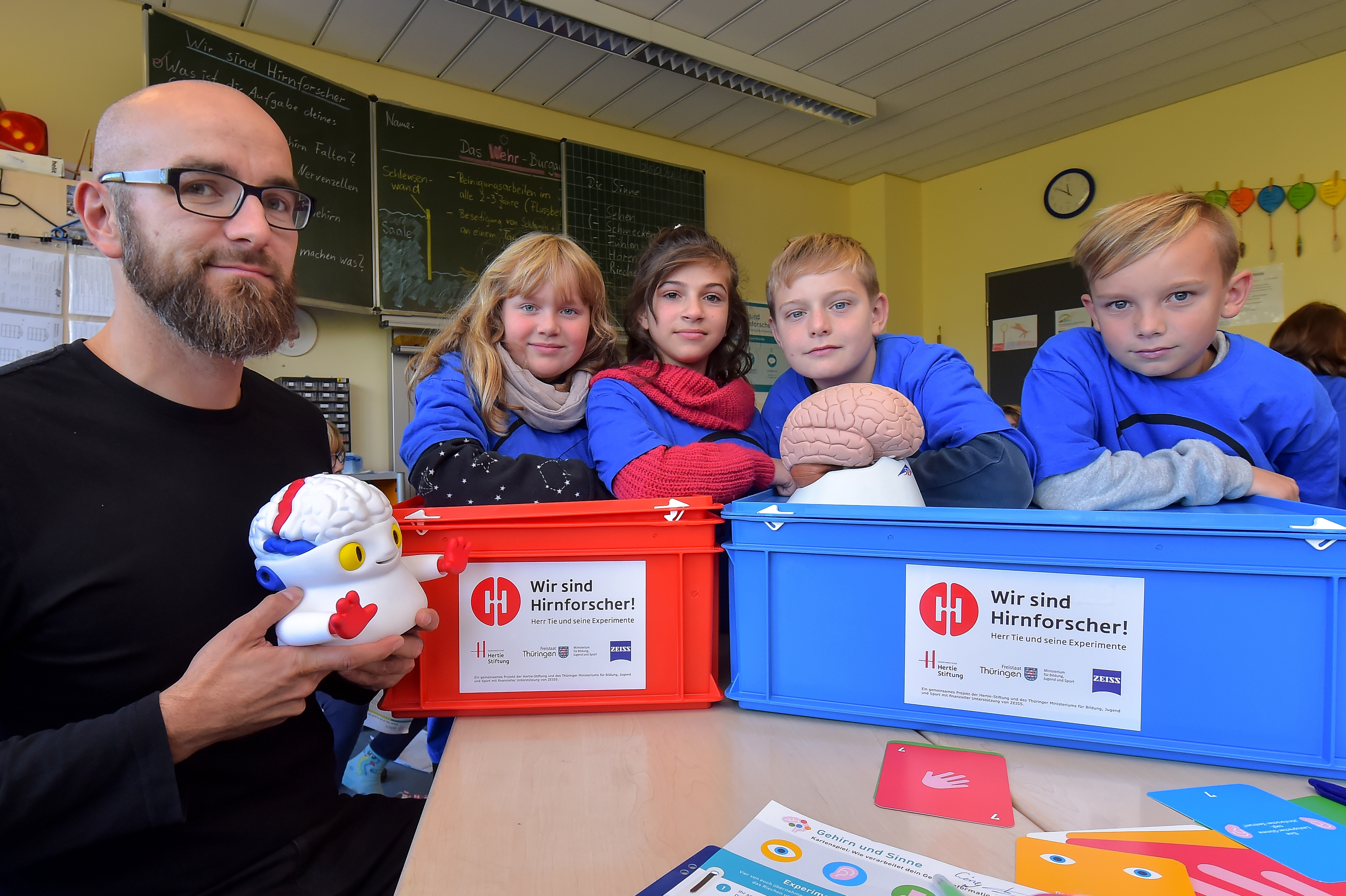 Stephan Kneise, Lehrer an der Gemeinschaftsschule Galileo in Jena Winzerla, hat die Hirnforscherbox der Gemeinnützigen Hertie-Stiftung gerade in einer vierten Klasse im Einsatz.
