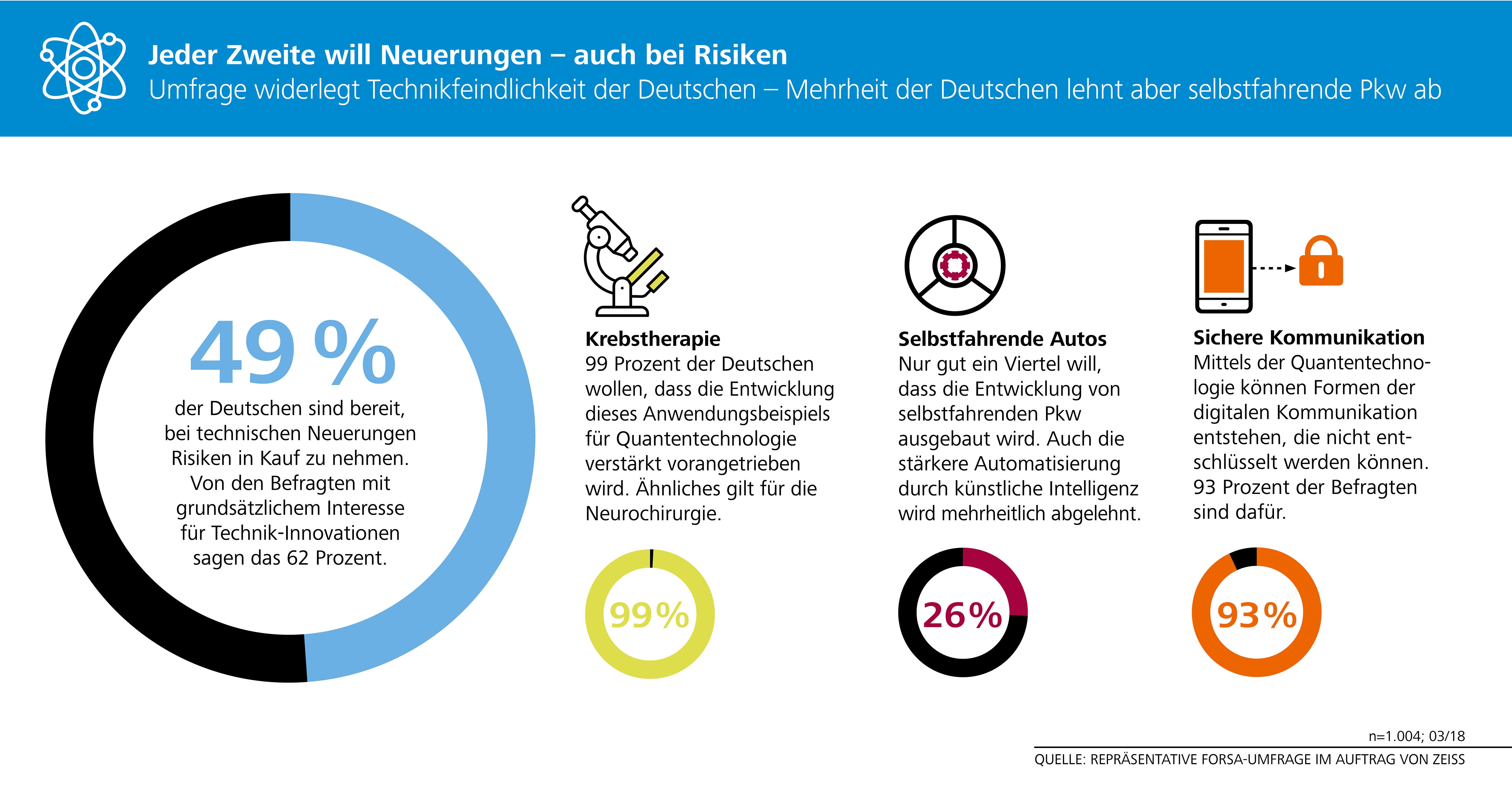 Fast jeder zweite Deutsche ist bereit, für technische Neuerungen Risiken einzugehen. Zur Weiterentwicklung von Anwendungen, beispielsweise durch die Quantentechnologie, gibt es ein sehr heterogenes Antwortbild. So halten 99 Prozent die Weiterentwicklung von gezielten Krebstherapien für wünschenswert. 72 Prozent wollen hingegen keine fortschreitende Entwicklung bei selbstfahrenden Autos.