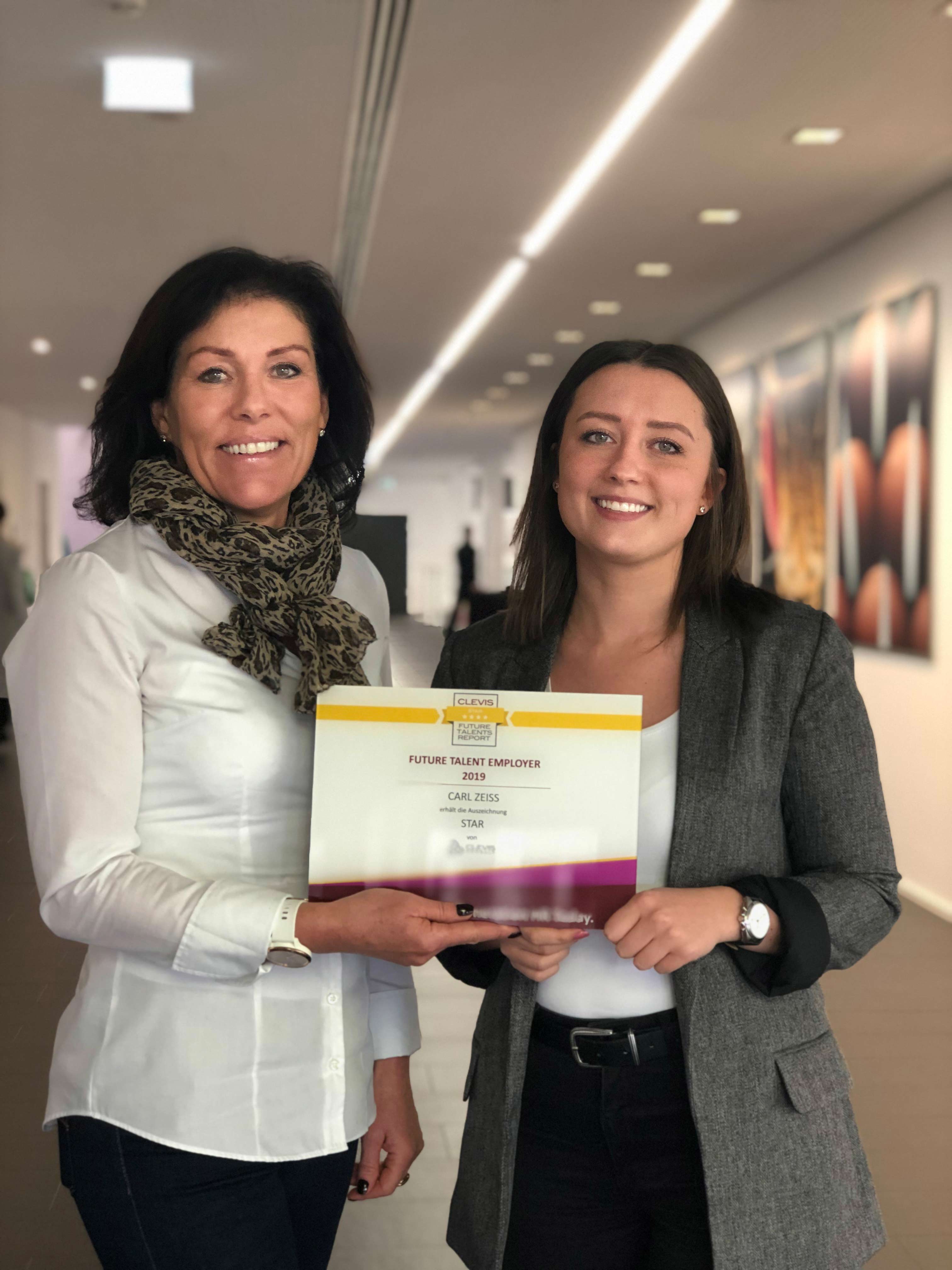 • Marion Maurer und Olga Mayer (v.l.) von Corporate Human Resources bei ZEISS mit der "STAR" Auszeichnung im CLEVIS Future Talents Report 2019.