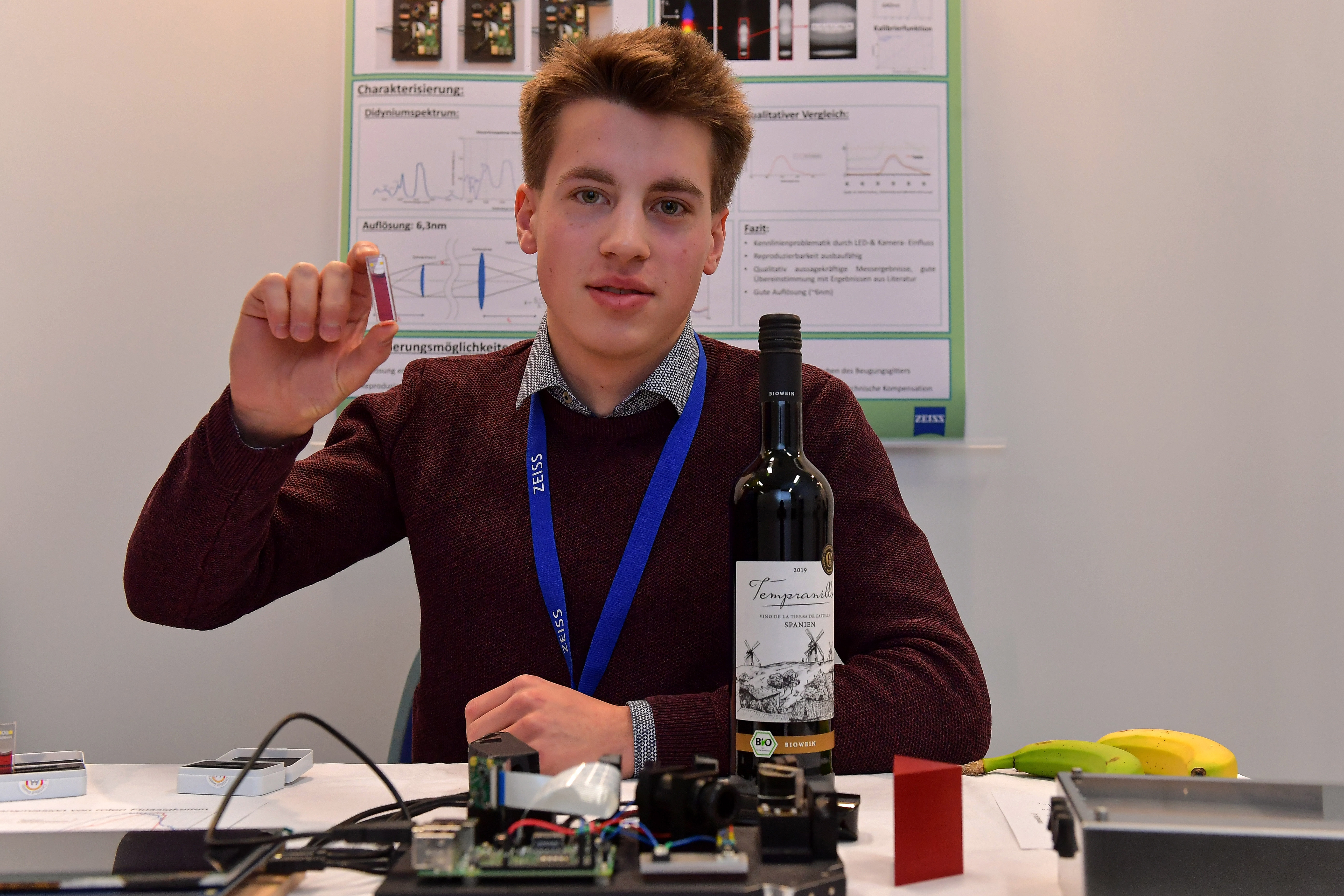 Den ersten Preis in der Sparte Jugend forscht im Bereich Technik erhielt Samuel Cumme vom Staatlichen Berufsbildenden Schulzentrum Jena-Göschwitz (SBSZ) für sein Projekt „Mobile Spektroskopie – Entwicklung eines Kleinspektrometers“. Er entwickelte ein mobiles Kleinspektrometer, mit dem eine Spektralanalyse in Transmission, Reflexion sowie die spektrale Untersuchung eines selbstleuchtenden Analyseobjekts durchgeführt werden kann. Cumme erhielt auch den Sonderpreis Qualitätssicherung für zerstörungsfreie Prüfung sowie den Sonderpreis Optik, der in diesem Jahr zum fünften Mal verliehen wurde. Prof. Dr. Michael Kaschke, Vorstandsvorsitzender der Carl Zeiss AG, hatte den Preis 2016 für die Dauer von fünf Jahren gestiftet. Der Preis in Höhe von jeweils 100 Euro soll an Gewinnerprojekte gehen, die sich mit dem Forschungsfeld optische Technologien auseinandersetzen.