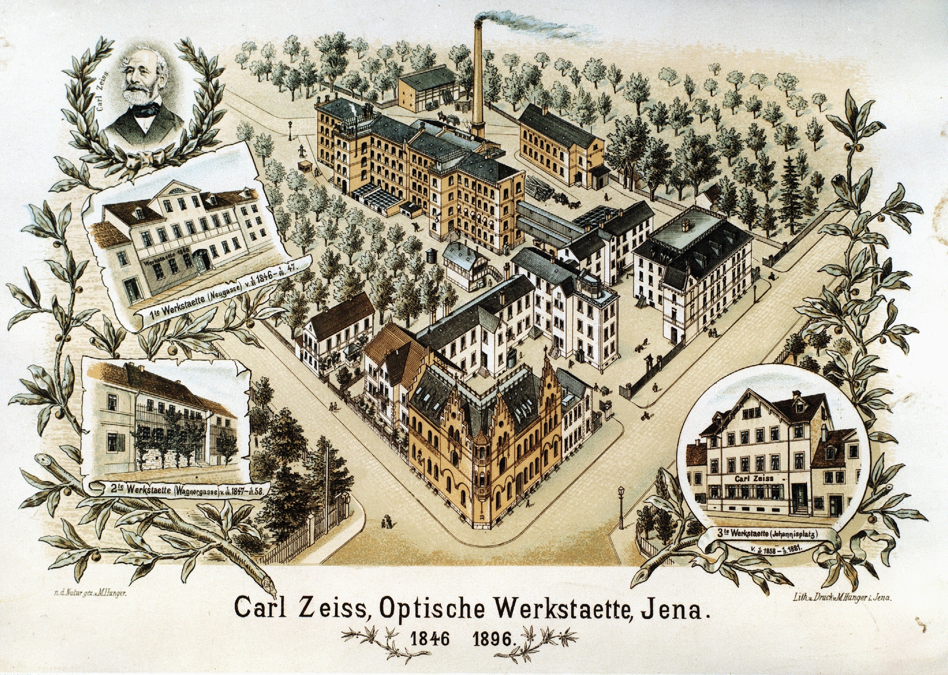 Jubiläumspostkarte der Optischen Werkstätte von Carl Zeiss 1896. Mit der ersten Werkstätte (Neugasse 7, 1846-1847), der zweiten Werkstätte (Wagnergasse 32, 1847-1858), der dritten Werkstätte (Johannisplatz 10, 1858-1881) und den ersten Gebäuden des zukünftigen Hauptwerks (seit 1881, ©ZEISS Archiv).