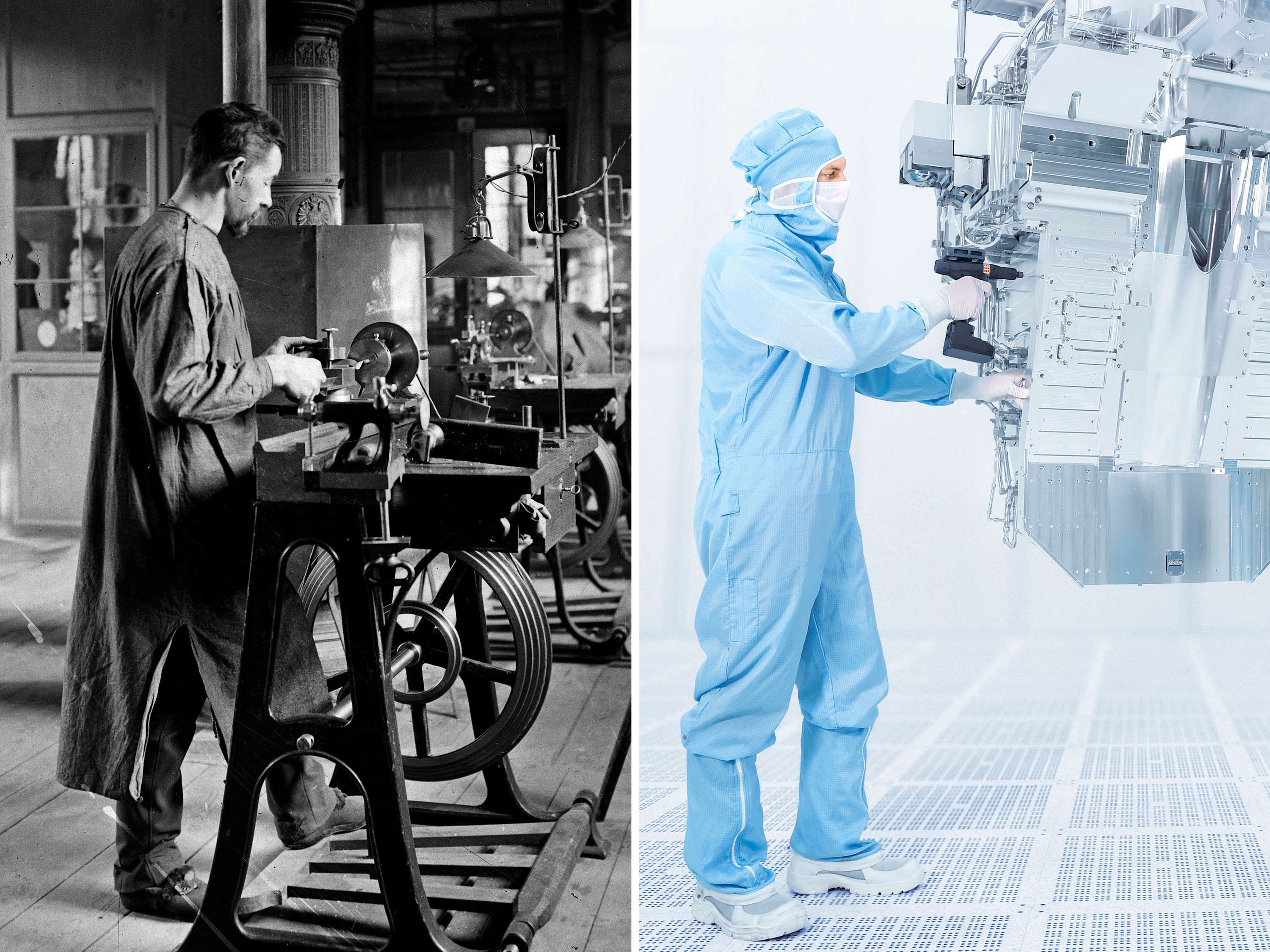 Die Technologien von morgen ermöglichen, galt bei ZEISS zu jedem Zeitpunkt: An der Optiker-Drehbank um 1900 oder bei der Fertigung des aus 15.000 Einzelteilen bestehendem und 1,5 Tonnen schwerem EUV-Beleuchtungssystem. Damit hat die ZEISS Sparte Semiconductor Manufacturing Technology (SMT), gemeinsam mit ASML, den Durchbruch in der EUV-Lithographie geschafft – und damit einen entscheidenden Technologiesprung in der Geschichte der Chipfertigung ermöglicht. Für die Entwicklung der EUV-Lithographie wurden ZEISS und seine internationalen Partnern mit dem Deutschen Zukunftspreis 2020 ausgezeichnet (©ZEISS Archiv und ZEISS).