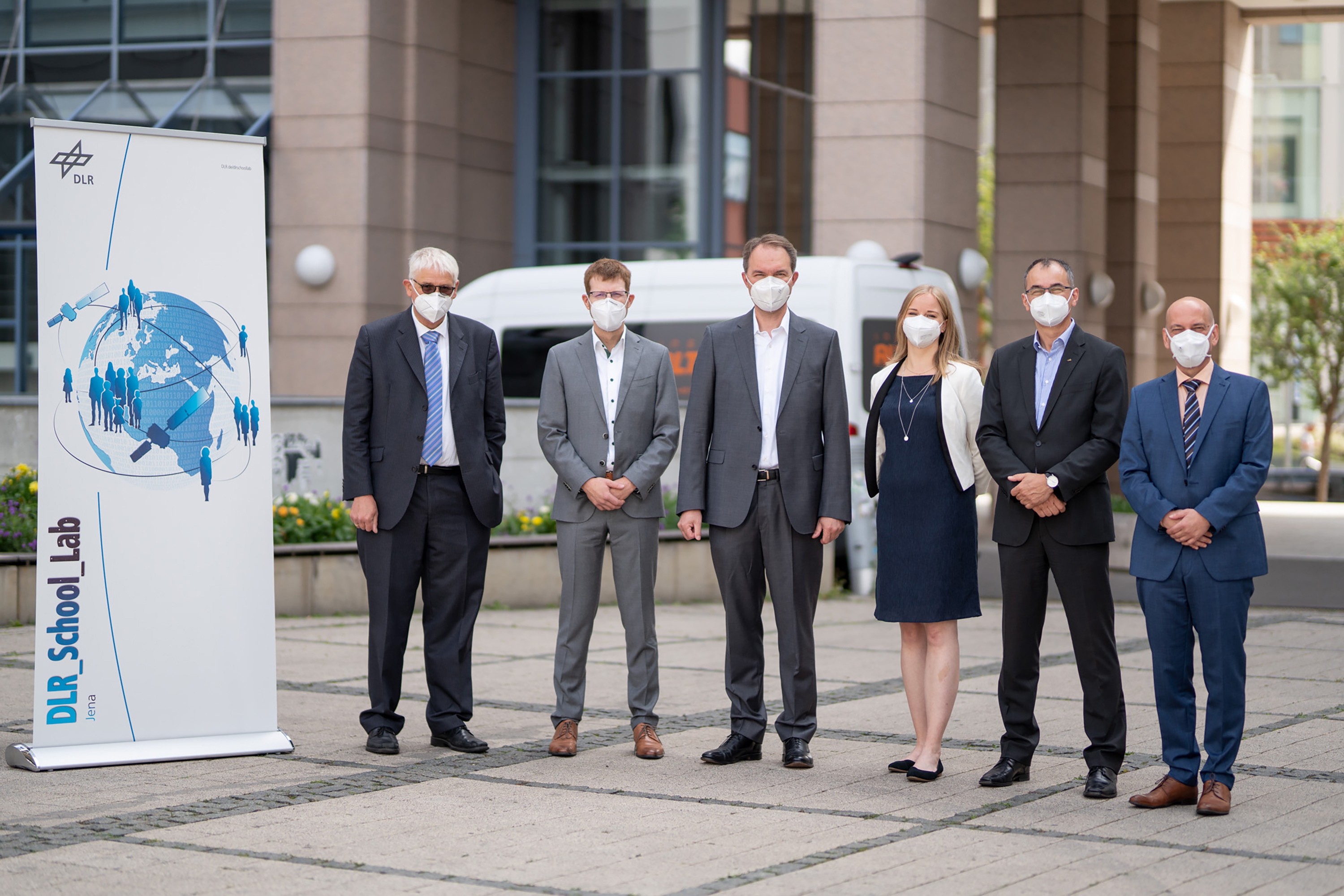 Prof. Dr. Hansjörg Dittus, Mitglied des DLR-Vorstands; Dr. Michael Albiez, Geschäftsführer der Carl Zeiss Microscopy GmbH; Dr. Ralf Kuschnereit, Executive Vice President Light & Optics bei Jenoptik; Dr. Carolin Altmann, Leiterin des DLR_School_Lab Jena; Andreas Peter, stellvertretender Leiter der DLR-Standorte Ost; Prof. Dr.-Ing. Joachim Denzler, Institutsdirektor des DLR-Instituts für Datenwissenschaften. (von links nach rechts)