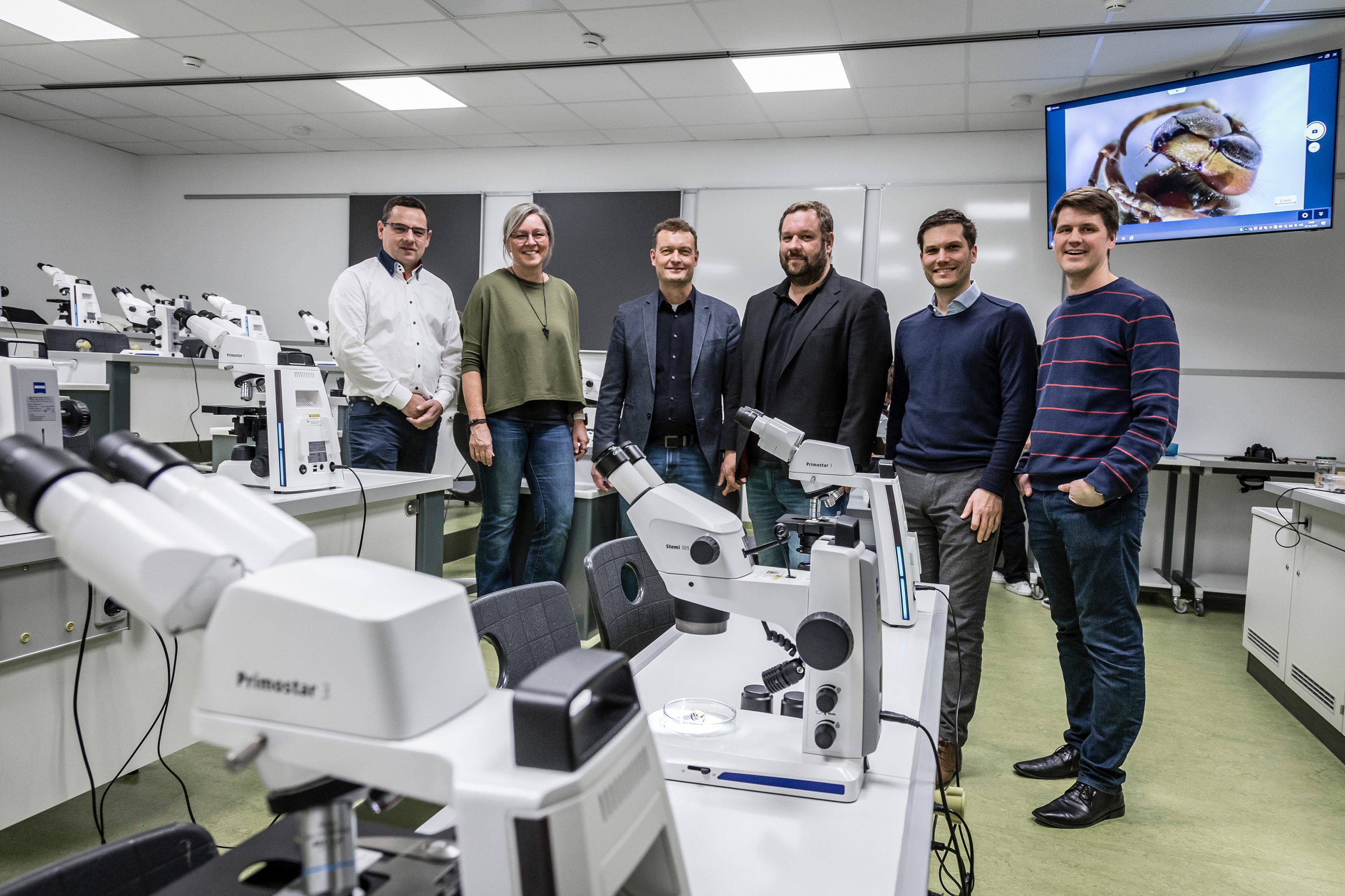 ZEISS Mikroskopiespezialist Dr. Frank Vogler richtete das Digitale Klassenzimmer ein und zeigte den Schülerinnen und Schülern sowie den Lehrenden, wie die Mikroskope funktionieren. „Größere Präparate können im Auf- sowie Durchlicht, Hell- oder Dunkelfeld dreidimensional an den Stereomikroskopen betrachtet. Kleinste Details in mikroskopischen Präparaten können im Durchlicht mit bis zu 1000-facher Vergrößerung sichtbar gemacht werden. Die einfach zu bedienenden Mikroskope besitzen alle integrierte LED-Beleuchtung“, so Vogler.