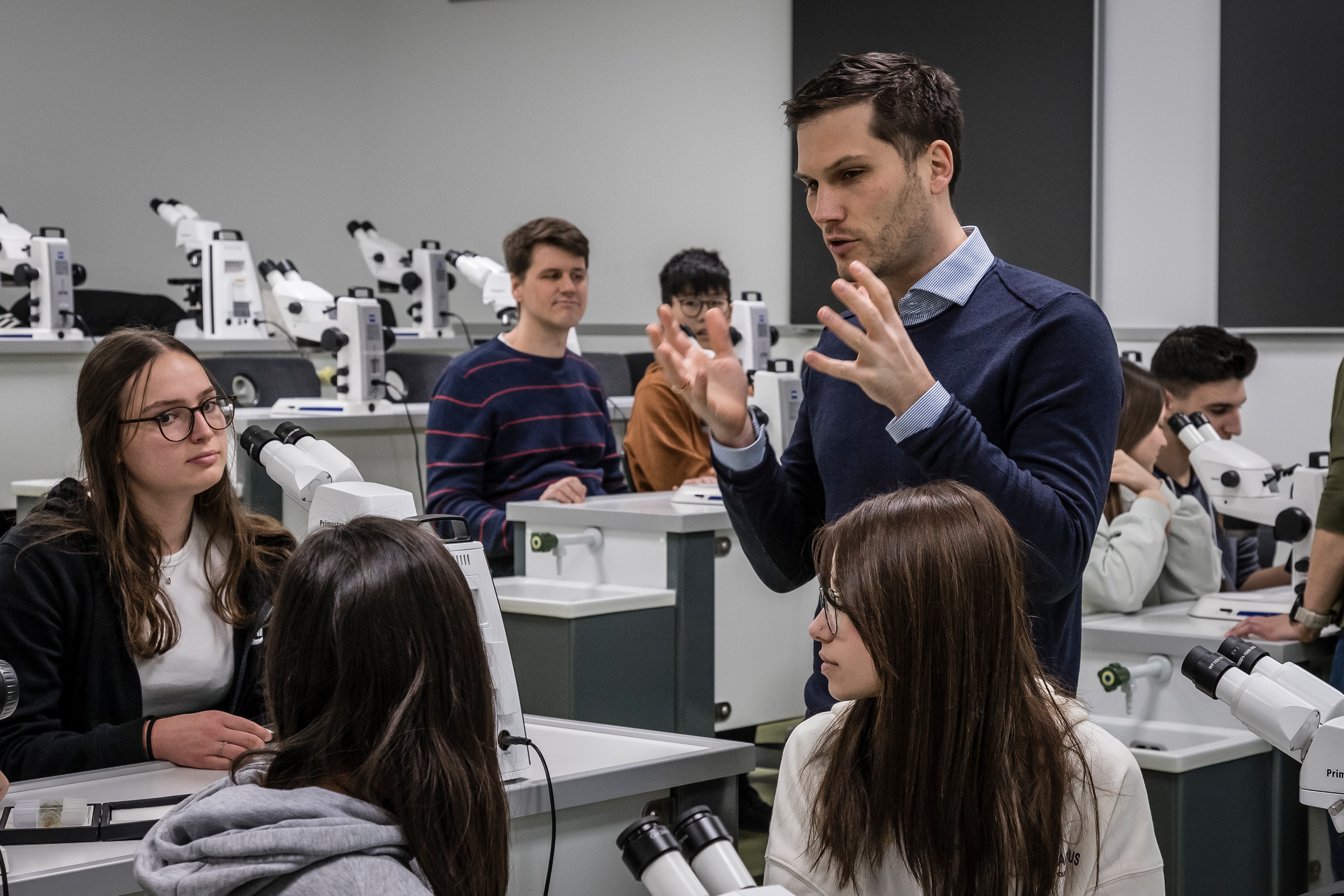 ZEISS Mikroskopiespezialist Dr. Frank Vogler richtete das Digitale Klassenzimmer ein und zeigte den Schülerinnen und Schülern sowie den Lehrenden, wie die Mikroskope funktionieren. Die Mikroskope und die HD-Streaming-Kameras für die beiden Lehrendengeräte ermöglichen einen praxisbezogenen und gleichzeitig vernetzten, modernen Biologieunterricht.