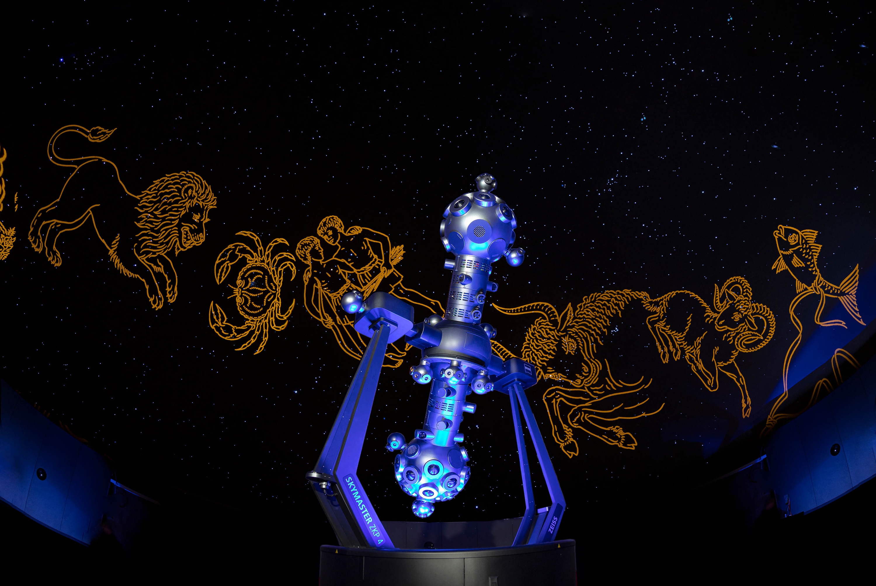 Dank einer Kombination spezieller Faseroptiken mit Hochleistungs-LED-Lichtquellen erzeugt der analoge Sternprojektor ZEISS SKYMASTER ZKP 4 einen brillanten Sternhimmel, den digitale Technologien nicht zu projizieren vermögen. Sechs ZEISS VELVET LED Projektoren bespielen vom Rand aus die gesamte Kuppel und erzeugen das kuppelfüllende Bild mit vielfältigen Darstellungen aus Astronomie, Wissenschaft, Kultur und Unterhaltung.