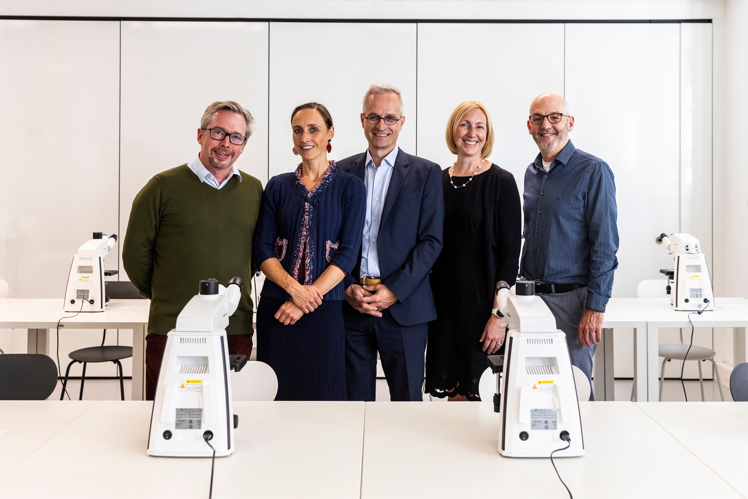Dr. Michael John Gorman und Dr. Auguste von Bayern (v.l.) freuen sich über die Mikroskope, die Corey Alguire, Rebecca Berghorn und Peter Amend (v.r.) im Namen von ZEISS an das BIOTOPIA Lab übergeben.