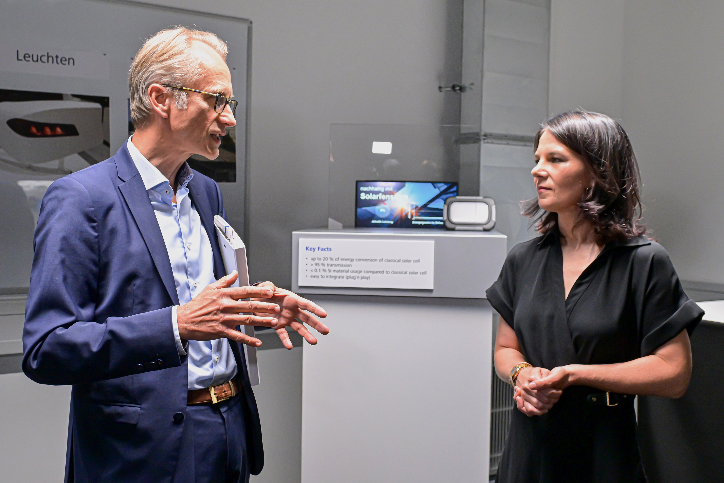Dr. Bernhard Ohnesorge, Geschäftsführer der Carl Zeiss Jena GmbH, zeigte Baerbock gemeinsam mit den Produktspezialistinnen Isabelle Maret und Dr. Yi Zhong-Schipp die Technologie der multifunktionalen smarten Gläser von ZEISS Microoptics, mit der es erstmalig möglich ist, transparentes Glas oder Kunststoff vielfältig und großflächig zu funktionalisieren. So können Glasflächen, wie Fensterscheiben, mit mikrooptisch strukturierten Schichten von ZEISS auch Energie produzieren. Damit werden die Vorteile des Lichteinfalls und dem uneingeschränkten Blick nach draußen von herkömmlichen Fenstern mit der zusätzlichen Gewinnung von elektrischem Strom miteinander kombiniert.
