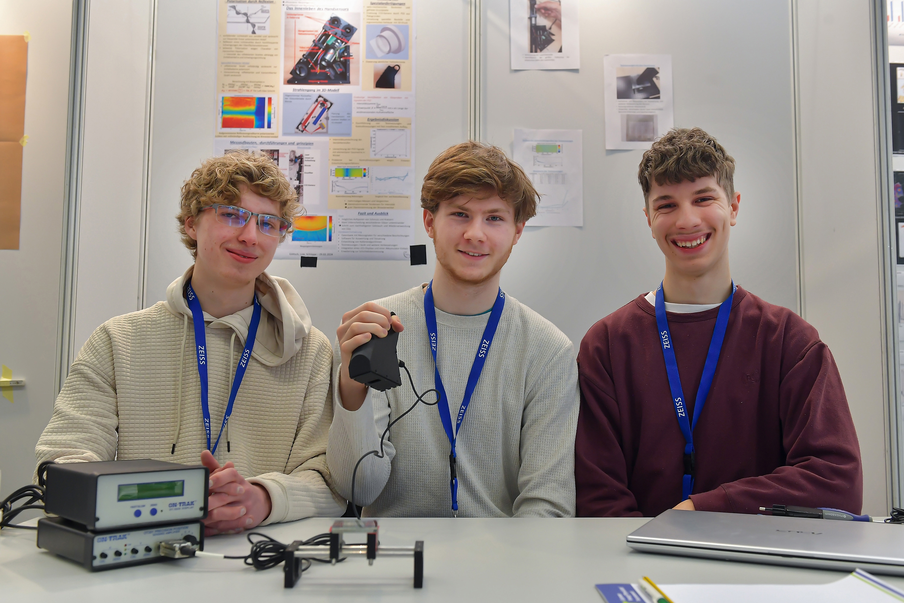• Den ersten Preis in der Sparte Jugend forscht im Bereich Physik erhielten Cedric Fabien Schöppe, Ambrosius Till Göttsch und Moritz Janek Link (v.l.) vom Carl-Zeiss-Gymnasium Jena für ihr Projekt „Der Bau eines Handsensors mithilfe von Brewsterwinkelreflektometrie“. Sie erhielten auch den Sonderpreis für Qualitätssicherung durch zerstörungsfreie Prüfung.