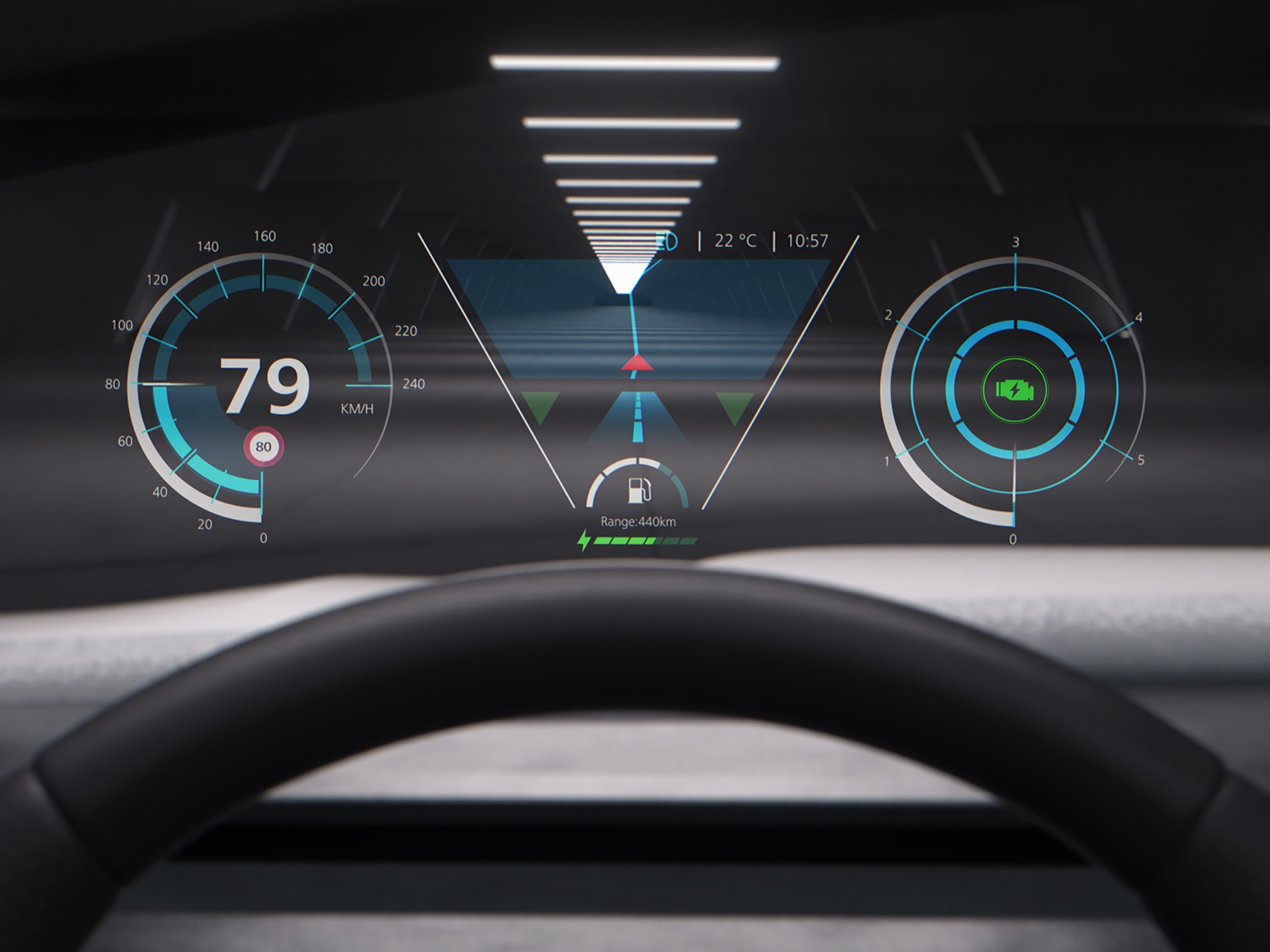 • Das in die Windschutzscheibe integrierte transparente Display zeigt relevante Fahrinformationen, wie die Navigation und Geschwindigkeit an. Es erlaubt eine ungestörte Sicht nach außen und ermöglicht es dem Fahrer, mehrere Informationen zu erfassen, ohne den Blick von der Straße abzuwenden, was zu mehr Sicherheit beiträgt.