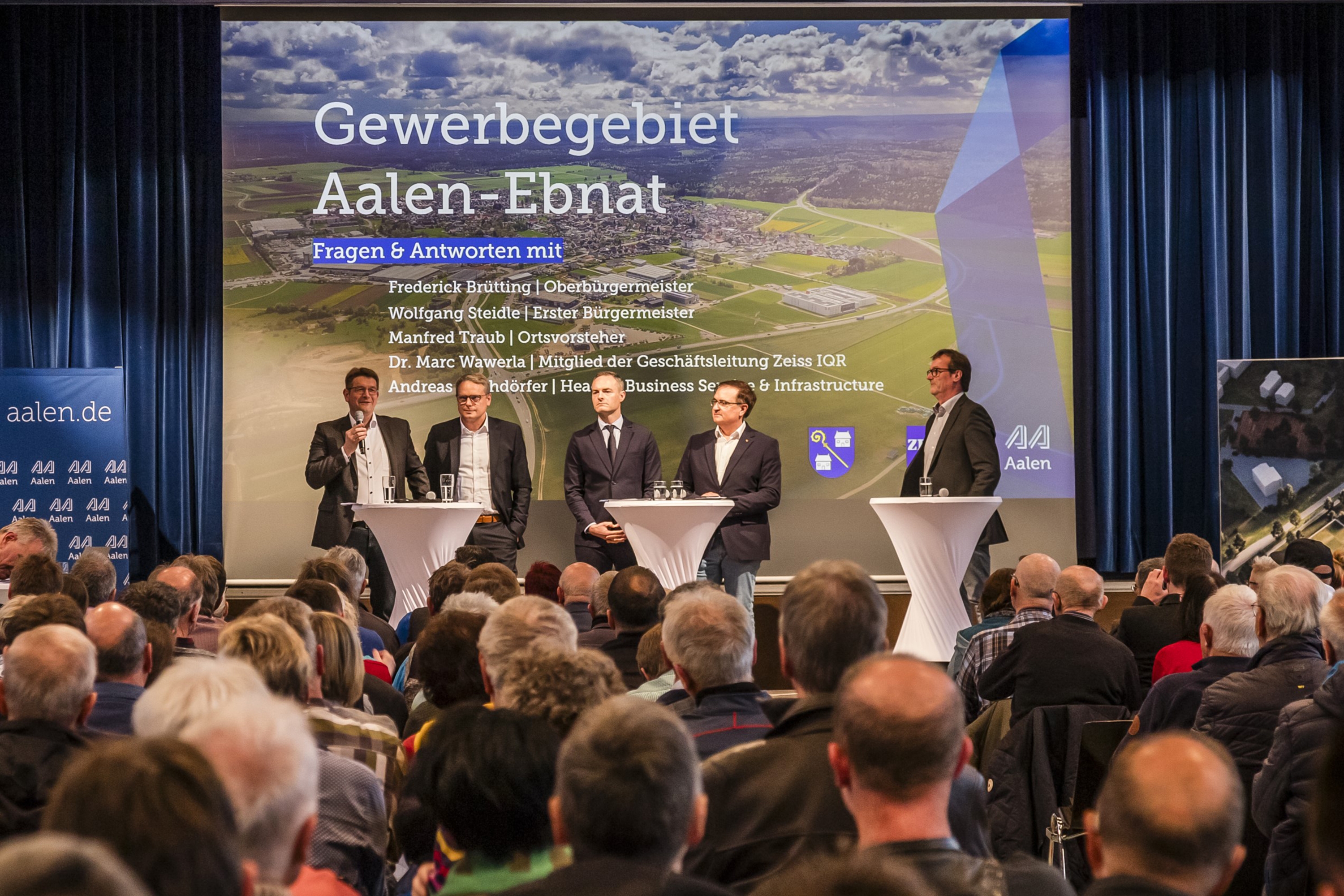 Um der interessierten Öffentlichkeit einen ausführlichen Überblick über den vorläufigen Planungsstand des neuen ZEISS Standortes für die Sparte Industrial Quality & Research (IQR) in Aalen-Ebnat zu geben, haben ZEISS und die Stadt Aalen zu einer gemeinsamen Informationsveranstaltung eingeladen. In der Jurahalle in Ebnat nutzten die Gäste die Gelegenheit, ihre Fragen direkt den Projektverantwortlichen zu stellen. Nach der Begrüßung durch Moderator Ralph Hamann stellten die Beteiligten zunächst das Gesamtprojekt ausführlich vor.