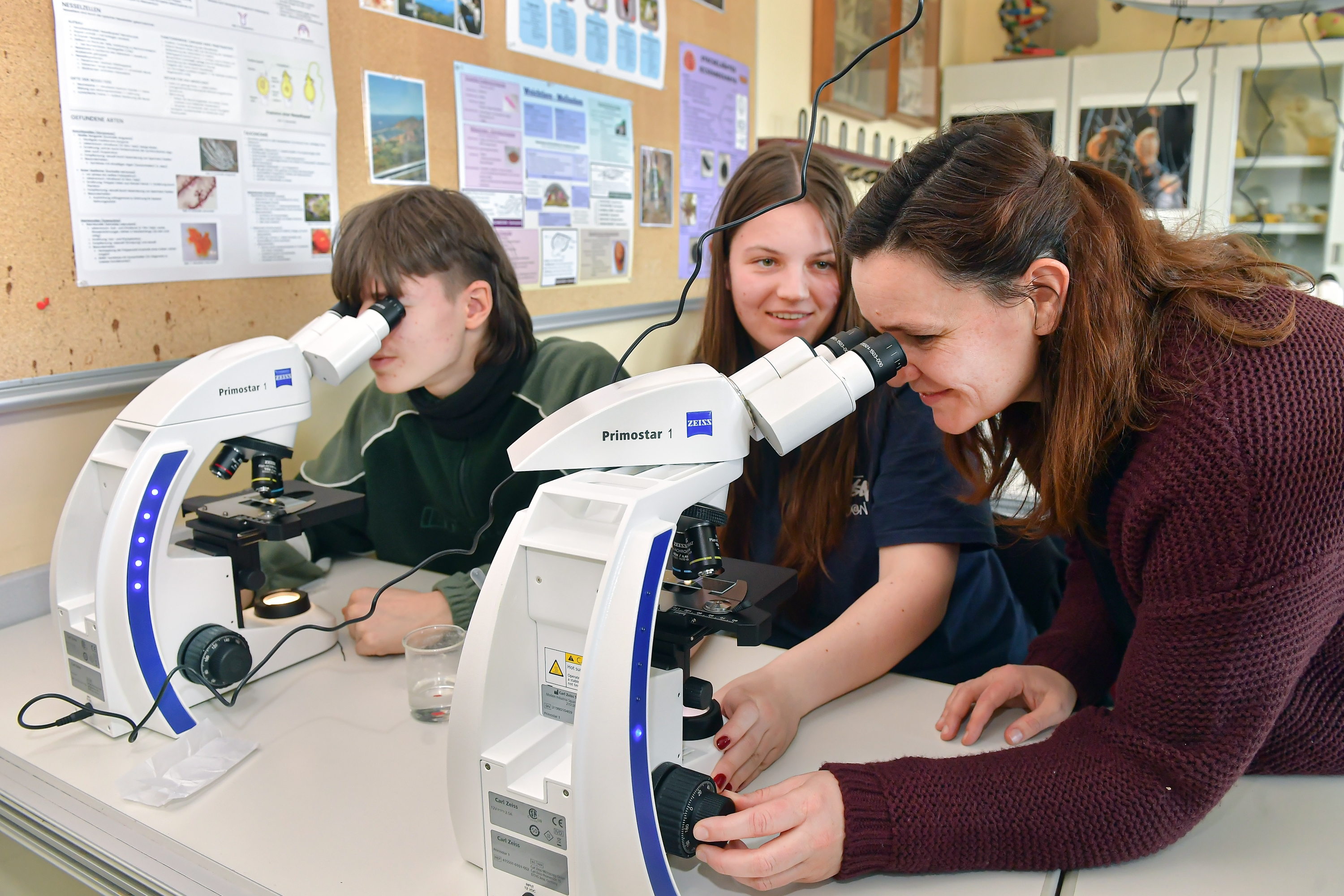 Sybille Weiß, Biologielehrerin am Gymnasium (rechts), mit Schüler:innen der 11. Klasse an den neuen ZEISS Mikroskopen.
