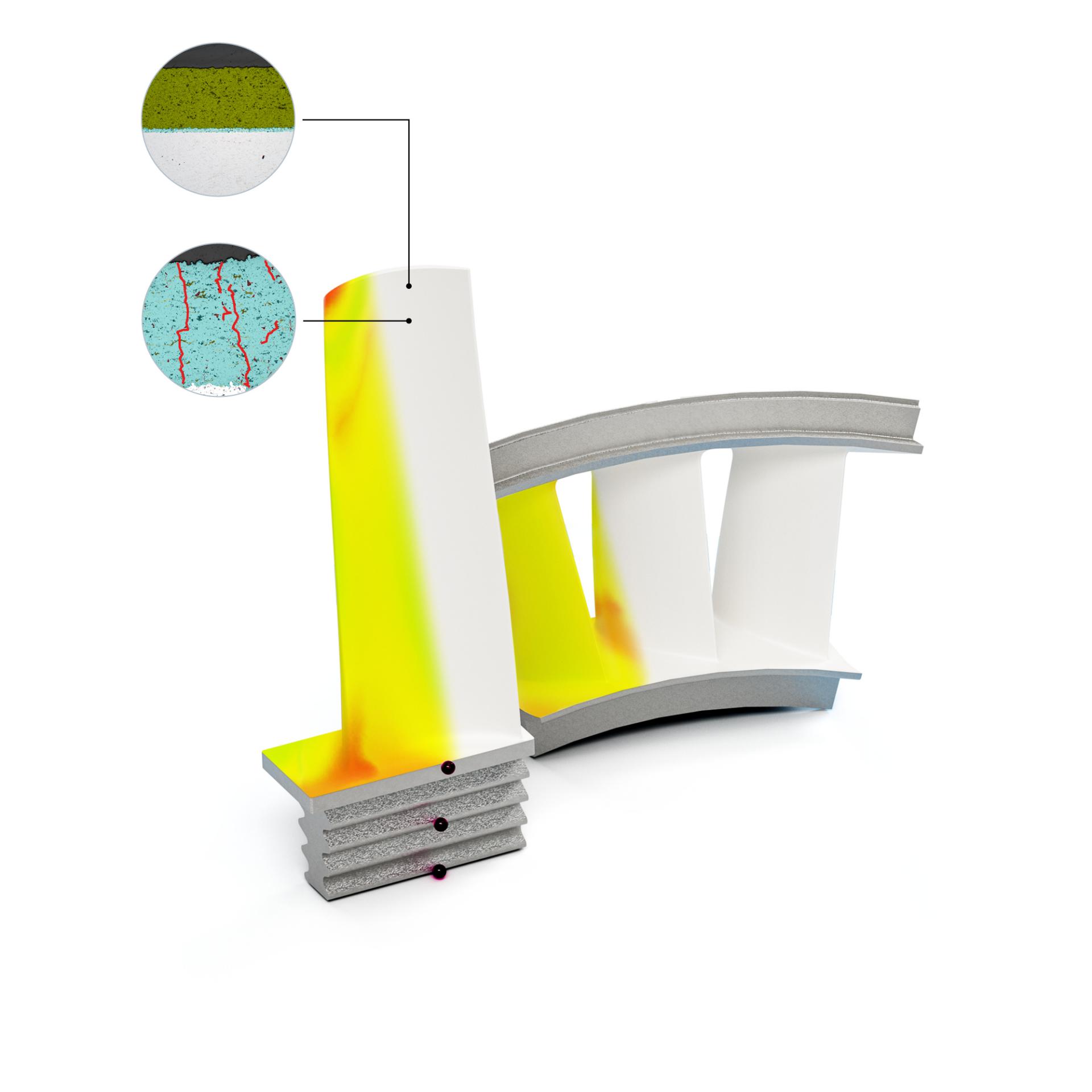 Die Analyse von Metalllegierungen, keramischen Werkstoffen und anderen Materialien ist ausschlaggebend, um die optimale Qualität und Leistung sämtlicher Komponenten sicherzustellen. Die Kombination aus den Materialeigenschaften und speziellen Fertigungsmethoden wie Gießen und Keramikbeschichtung stellt eine Herausforderung dar, um Hochleistungskomponenten zu produzieren, die extremen Temperaturanforderungen standhalten. Die Qualität der Teile muss durch fortlaufende Fehleranalysen kontinuierlich verbessert werden, sowohl zu Beginn als auch am Ende ihres Lebenszyklus.