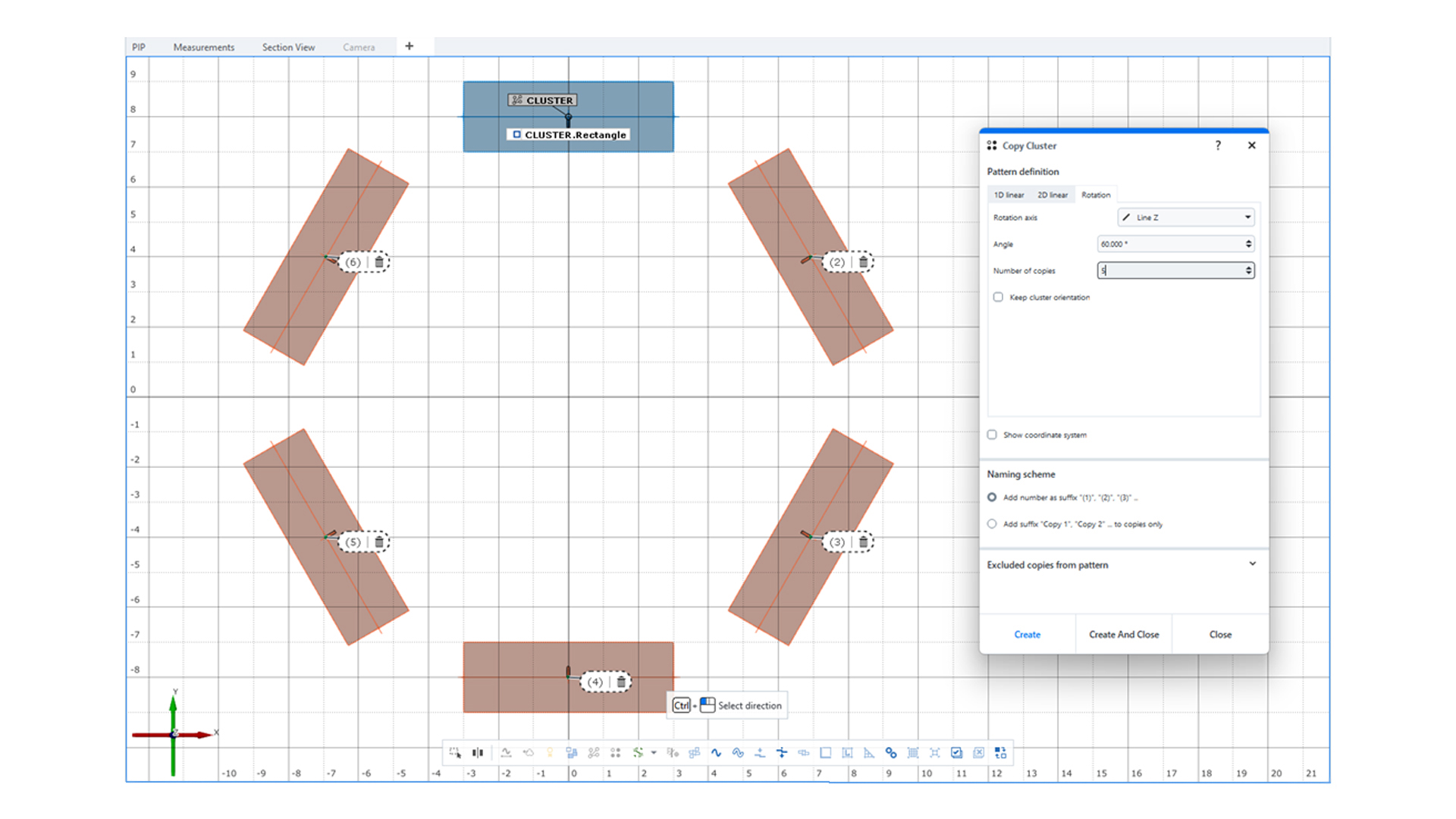 Vereinfachen Sie Ihre Arbeitsabläufe mit übersichtlichen 3D-Ansichten und einer optimierten Vorschau. Nutzen Sie die neuen Optionen zur Definition von vordefinierten Mustern für das Kopieren von Clustern. Die Übertragung von Änderungen an Cluster-Elementen auf vorhandene Cluster-Kopien wird so verbessert.