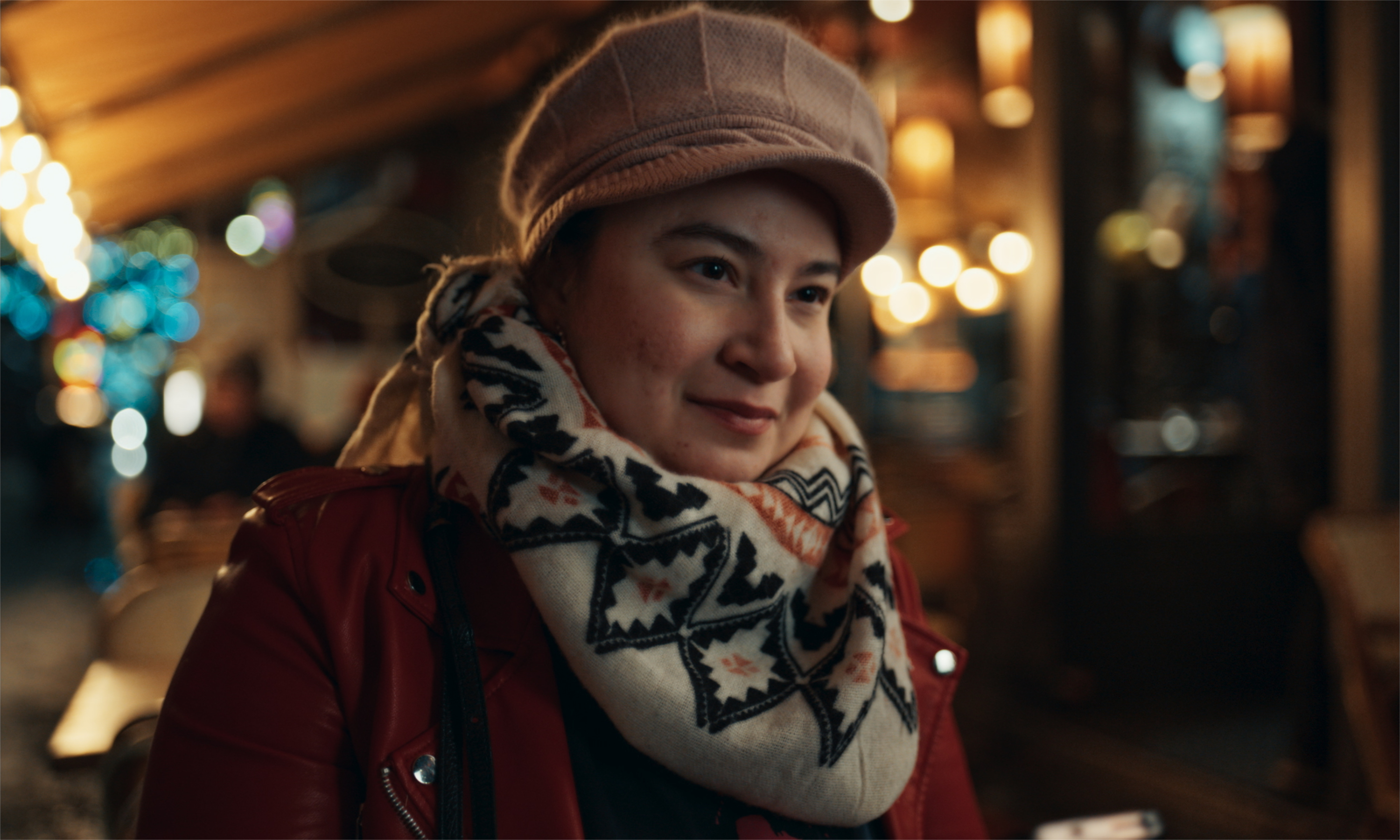 • Pascale Marin bedient eine Kamera mit dem Zeiss Aatma 85 Cinematic‑Objektiv in einem festlich beleuchteten Fußgängerbereich. Pascale Marin trägt Handschuhe und eine wollene Mütze in dunklen, gedeckten Farben.