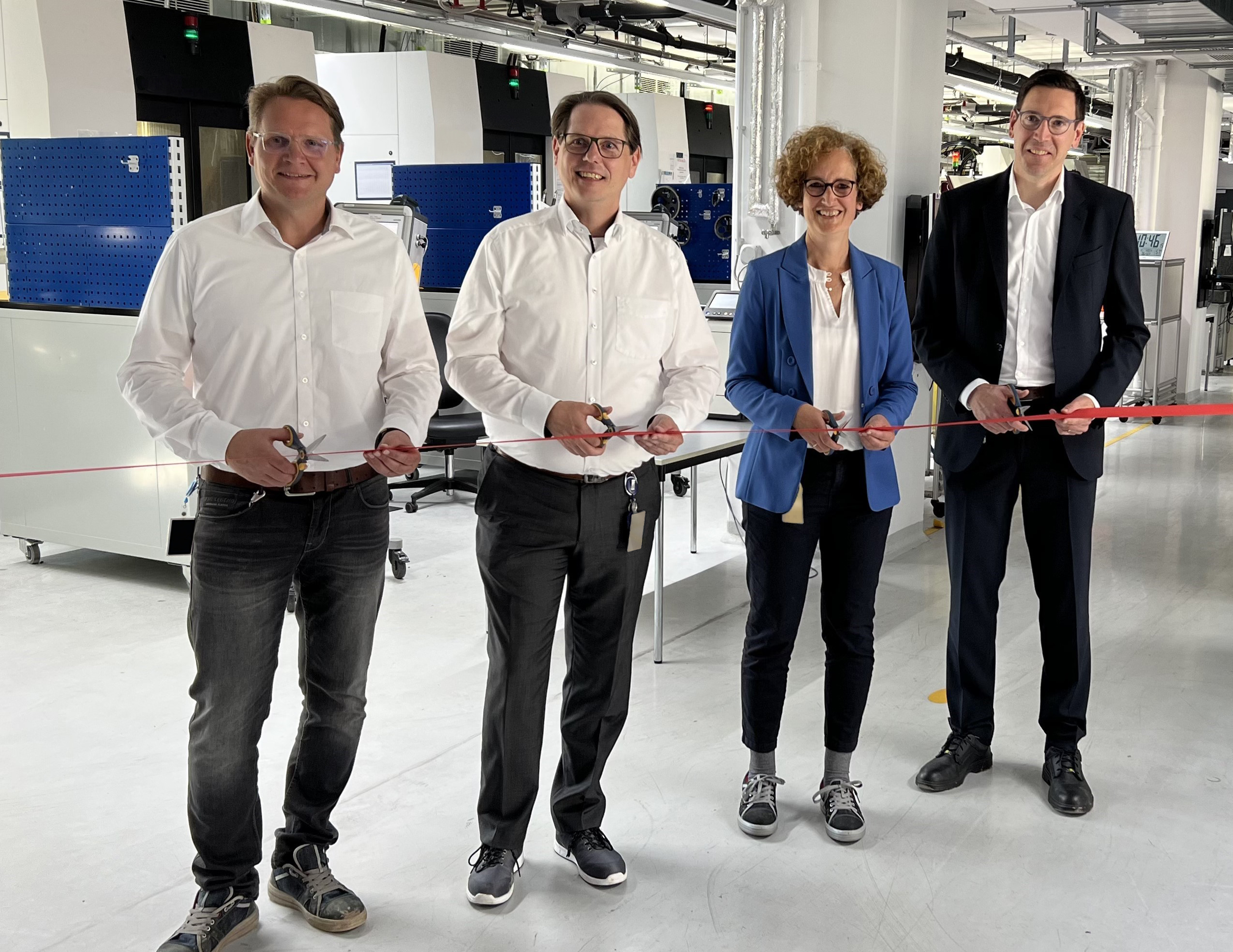 Bei der Eröffnung der neuen Produktionsflächen: Projektverantwortlicher Thomas Cammerer, Christian Pulz aus dem SMT-Infrastruktur-Bereich, SMT-Standortleiterin Katrin Ariki sowie CFO Torsten Reitze (alle ZEISS) haben symbolisch das rote Band durchgeschnitten.