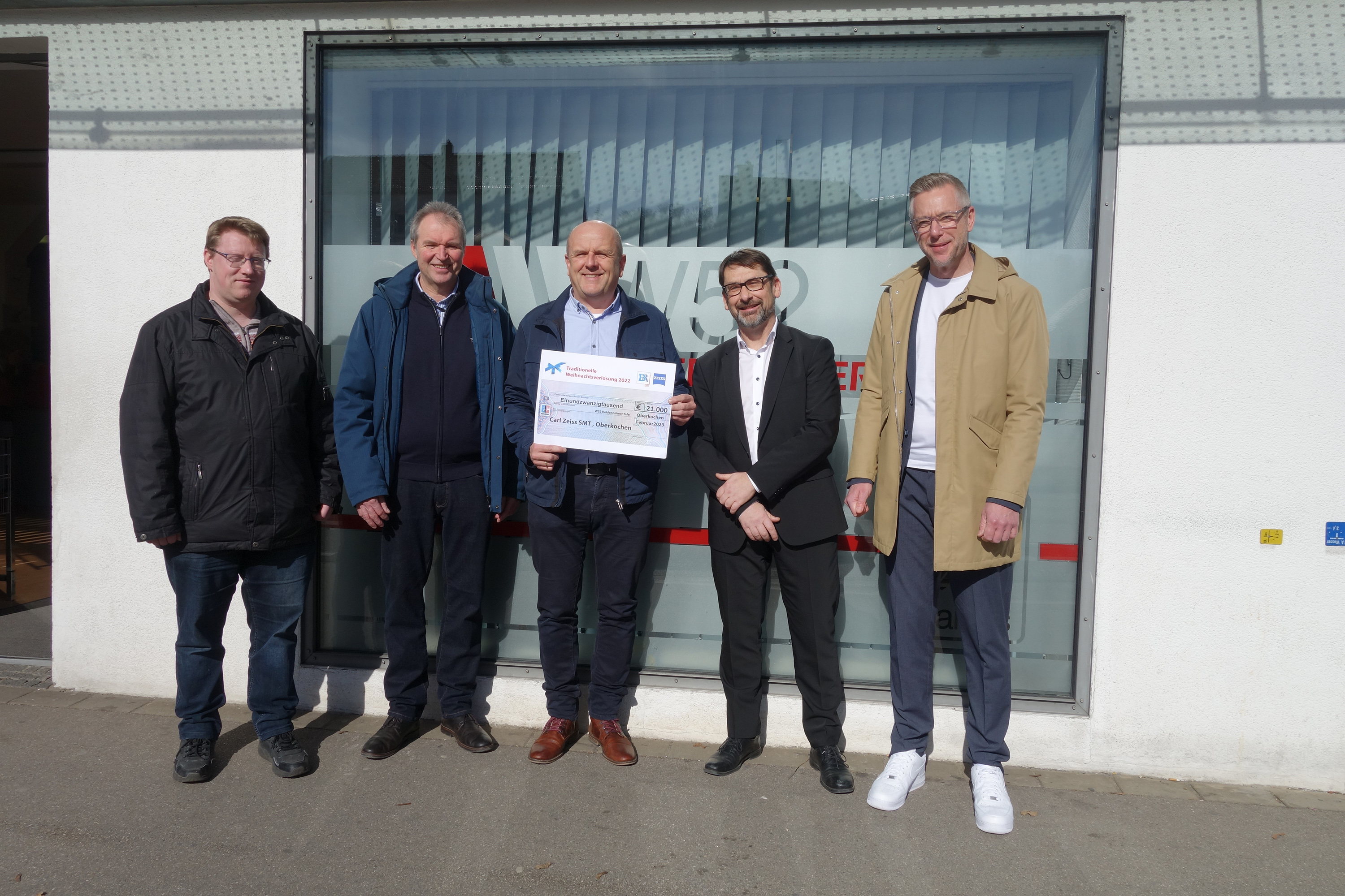 Große Freude auch bei der Spendenübergabe in Heidenheim (v.l.): Dietmar Wotsch (Tafel Heidenheim), Gerhard Bösner (ZEISS SMT Betriebsrat), Artur Franzke (ZEISS SMT Betriebsrat), Dr. Jens Werner (ZEISS) und Markus Mengemann (Tafel Heidenheim).