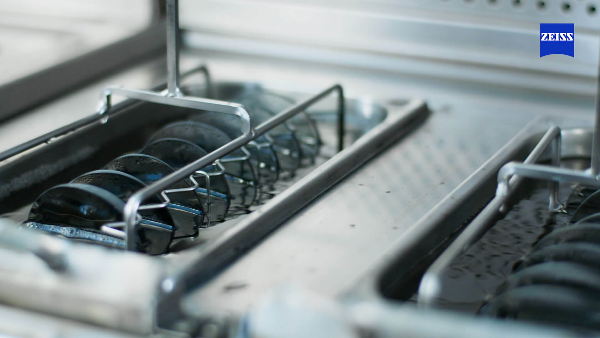 Nun wird das Brillenglas sanft vom Blockstück getrennt („abgeblockt“). Da das Verbindungsmetall zwischen Glas und Blockstück bereits bei knapp 50 Grad Celsius schmilzt, wird es dazu einfach in heißes Wasser getaucht. Bei der anschließenden Reinigung geht es ein wenig zu wie in der Autowaschanlage: Mit Bürsten, verschiedenen Reinigungsmitteln und hochreinem (also besonders gründlich gereinigtem) Wasser werden die Gläser von Produktionsspuren befreit und für die Beschichtung vorbereitet. Am Ende werden die Brillengläser trockengeföhnt. In jedem Werk ist Umweltschutz eine Selbstverständlichkeit: Materialien, wie das Verbindungsmetall, werden aufbereitet und wiederverwendet, benötigtes Wasser umweltschonend recycelt.